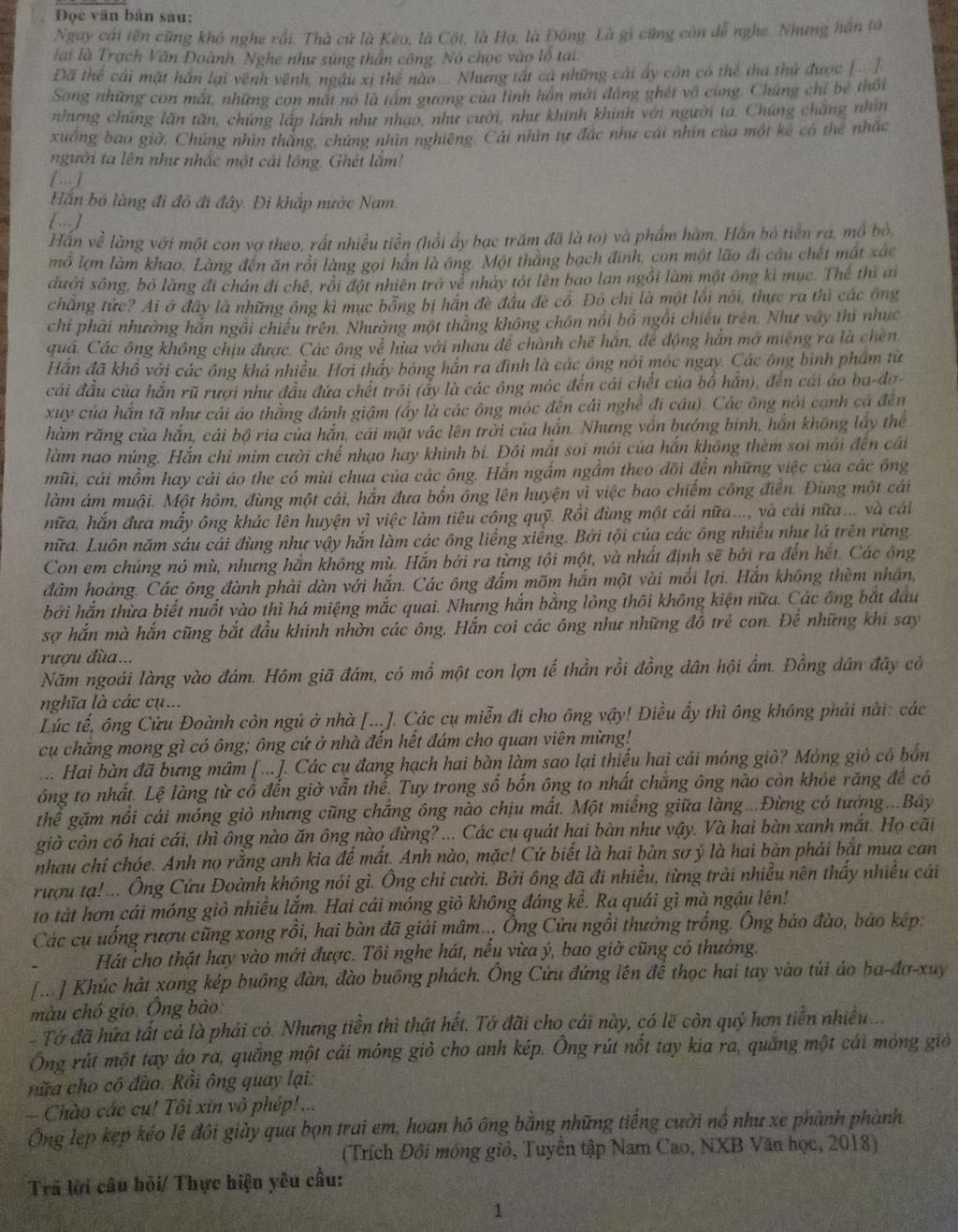 Câu 5: Sự đồng thuận của dư luận trước hành động sỉ nhục bọn hào lí của Trạch Văn Đoành. Hình ảnh này thể hiện sự mỉa mai, châm biếm sâu sắc. Tiếng cười của bọn trai trẻ không chỉ là sự vui vẻ đơn thuần mà còn là biểu hiện của sự chế giễu một xã hội nông thôn rệu rã, nơi những giá trị đạo đức bị đảo lộn, và sự ngưỡng mộ dành cho những kẻ khôn khéo như Trạch Văn Đoành.