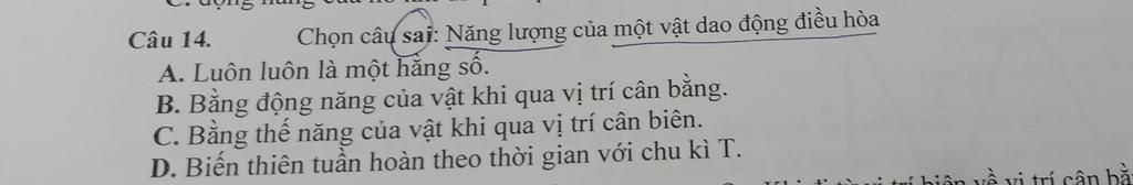 - Câu A đúng vì năng lượng của 1 vật dao động điều hòa không thay đổi theo thời gian nên luôn luôn là 1 hằng số.