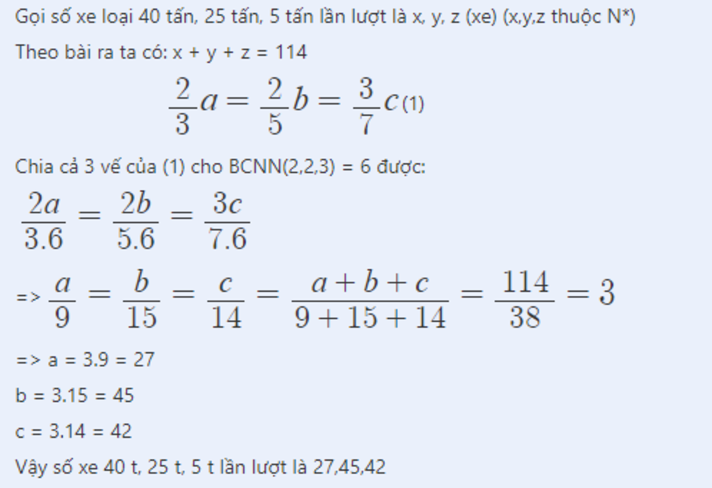 Vậy trạm đó có 45 chiếc xe 40 tấn, 27 chiếc xe 25 tấn và 42 chiếc xe 5 tấn