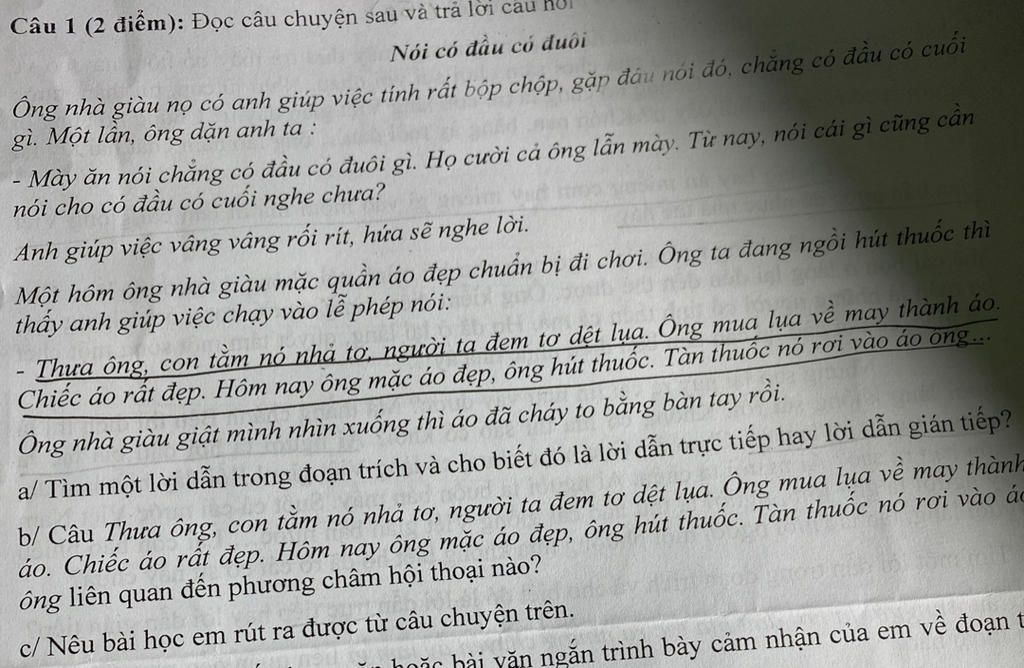 Một lời dẫn trực tiếp trong đoạn trích : Mày ăn nói chẳng có đầu có đuôi gì. Họ cười cả ông lẫn mày. Từ nay, nói cái gì cũng cần nói cho có đầu có cuối nghe chưa?