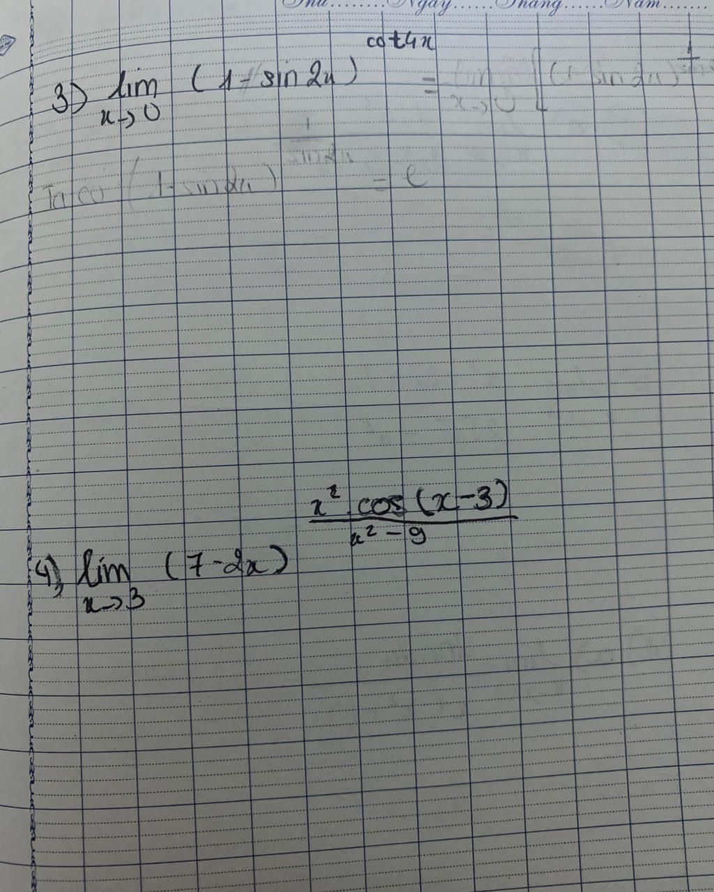 `4)` `lim_{x to 3} (7-2x)^((x^2*cos(x-3))/(x^2-9))`