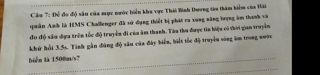 Với tốc độ truyền đi của âm thanh trong nước biển là 1500 m/s và thời gian truyền khứ hồi là 3.5s, ta có: