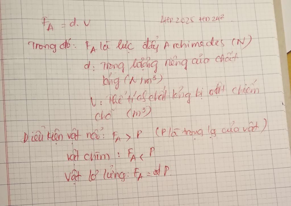`-` Điều kiện vật nổi: `F_A > P`