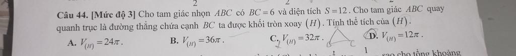 Câu 44. [Mức độ 3] Cho tam giác nhọn ABC có BC =6 và diện tích S=12. Cho tam giác ABC quay
