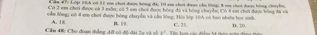 số học sinh chơi bóng đá và cầu lông là n(A∩ B)=4