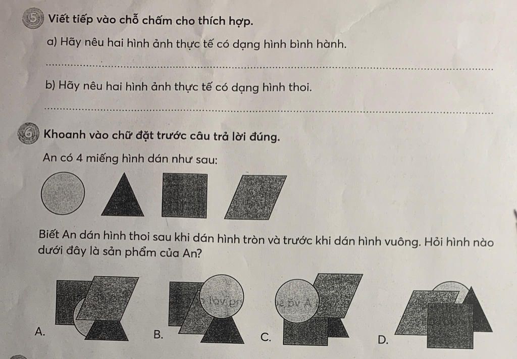 $\text{Vì An dán hình thoi sau khi dán hình tròn và trước khi dán hình vuông}$