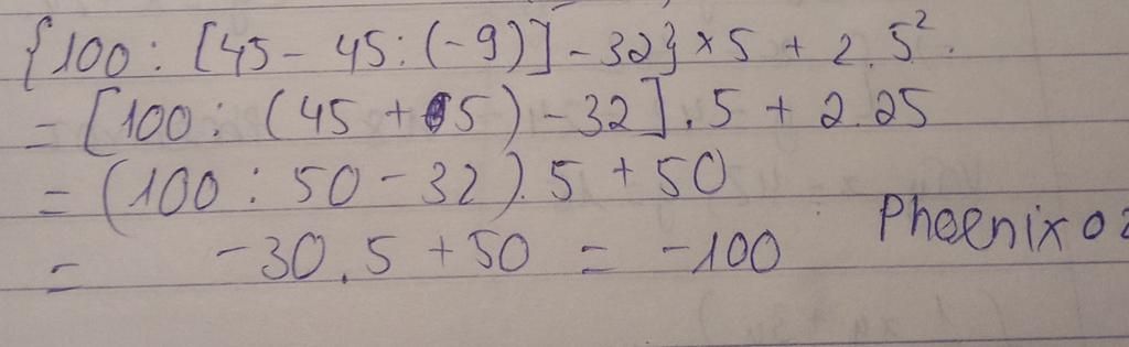 {100:[45-45:(-9)]-32}×5+2×5mũ 2