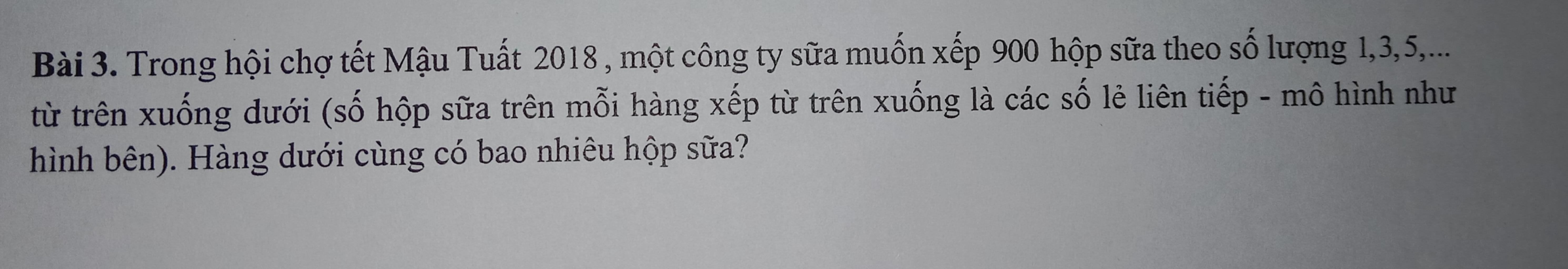 `@\text{Theo đề ta có: }` `u_1=1; d=2; S_n=900`$\\$ `@\text{Với}` `S_n=(n[2u_1+(n-1)d])/2=900`$\\$ `=>(n[2.1+(n-1).2])/2=900`$\\$ `=>n(2+2n-2)=1800`$\\$ `=>2n^2=1800`$\\$ `=>n^2=900`$\\$ `=>[(n=30 ㅤ\text{(thoả)}),(n=-30ㅤ\text{(loại)}):}`$\\$ `@u_30=u_1+29.d=1+29.2=59`$\\$ `\text{Vậy hàng dưới cùng có 59 hộp sữa. }`
