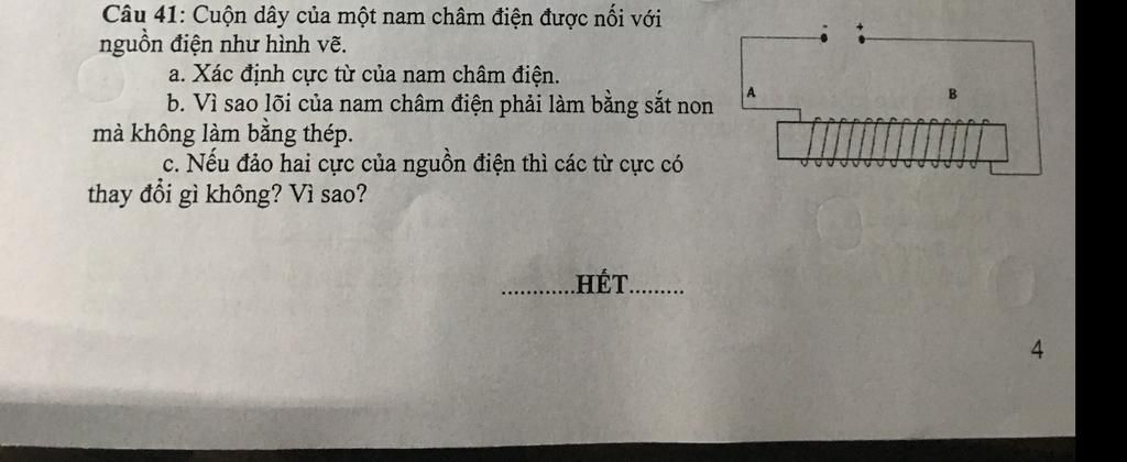 b. Lõi nam châm điện làm bằng sắt (non) vì mặc dù sắt nhiễm từ yếu hơn thép nhưng bị khử từ nhanh. Do đó khi ngắt dòng điện nam châm điện sẽ mất hết từ tính.