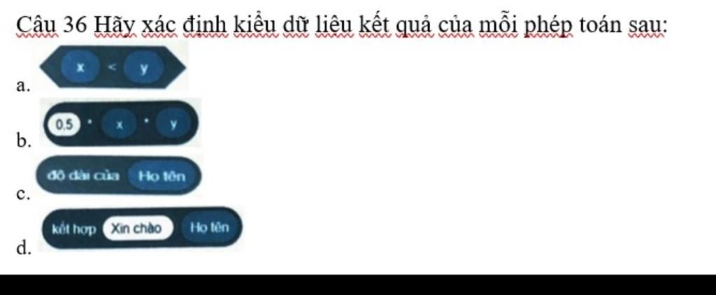 Kiểu dữ liệu kết quả của mỡi phép toán sau là :