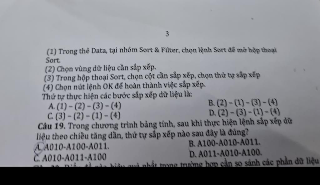 Thứ tự thực hiện các bước sắp xếp dữ liệu là