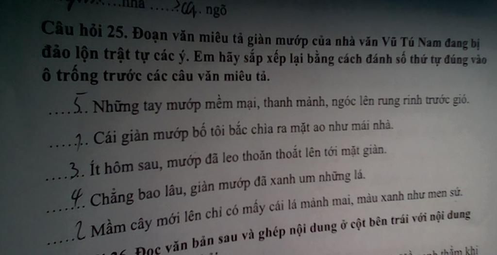 Cái giàn mướp bố tôi bắc chìa ra mặt ao như mái nhà. Mầm cây mới lên chỉ có mấy cái lá mảnh mai, màu xanh như men sứ. Ít hôm sau, mướp đã leo thoăn thoắt lên tới mặt giàn. Những tay mướp mềm mại, thanh mảnh, ngóc lên rung rinh trước gió. Chẳng bao lâu, giàn mướp đã xanh um những lá.
