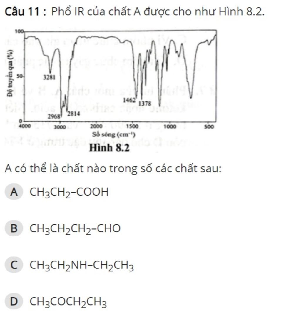 Nhận xét: Đỉnh hấp thụ cực đại ở số sóng $2968 cm^{-1}$, ứng với liên kết $O-H$ của carboxylic acid. Do đó hợp chất có thể có nhóm $COOH$.