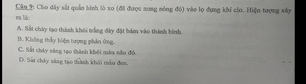 Câu 9: Cho dây sắt quấn hình lò xo (đã được nung nóng đỏ) vào lọ đựng khí clo. Hiện tượng xảy