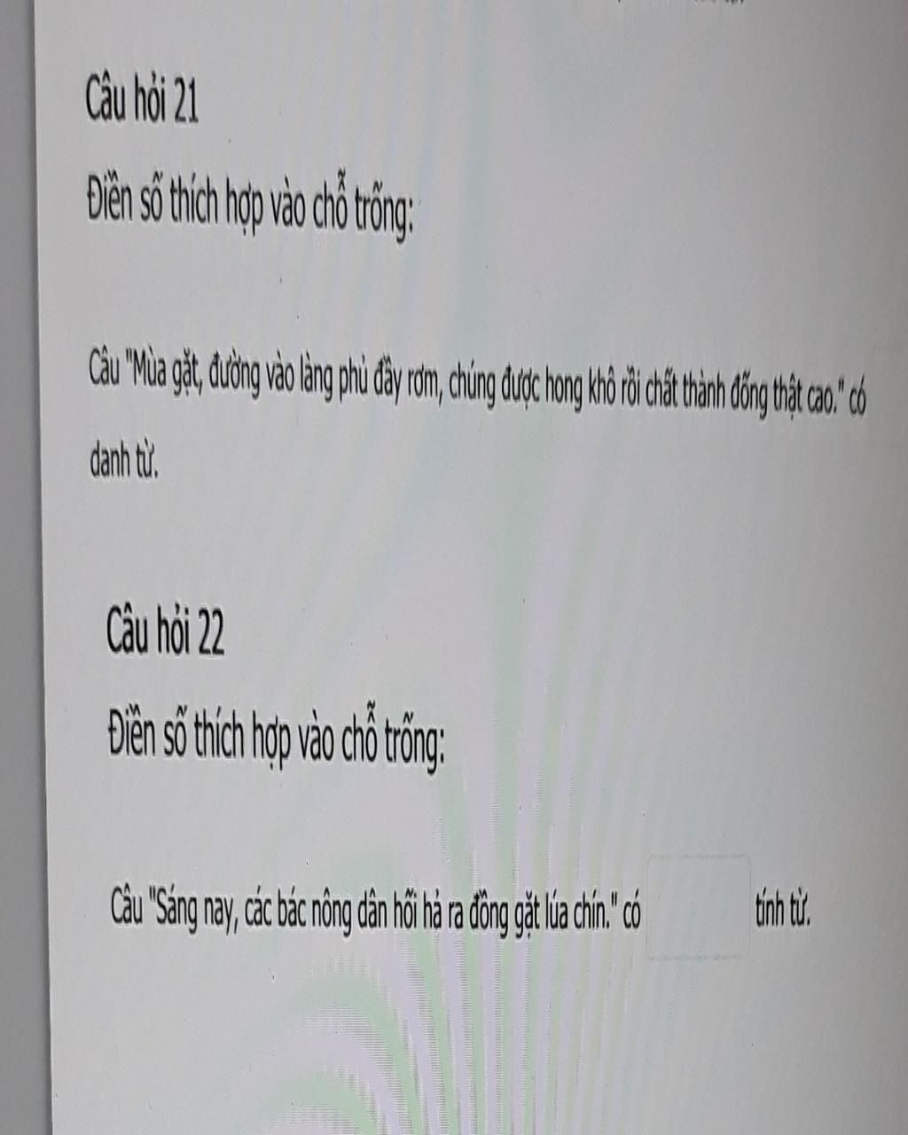 Câu "Mùa gặt, đường vào làng phủ đầy rơm, chúng được hong khô rồi chất thành đống thật cao." có tất cả là 4 danh từ.