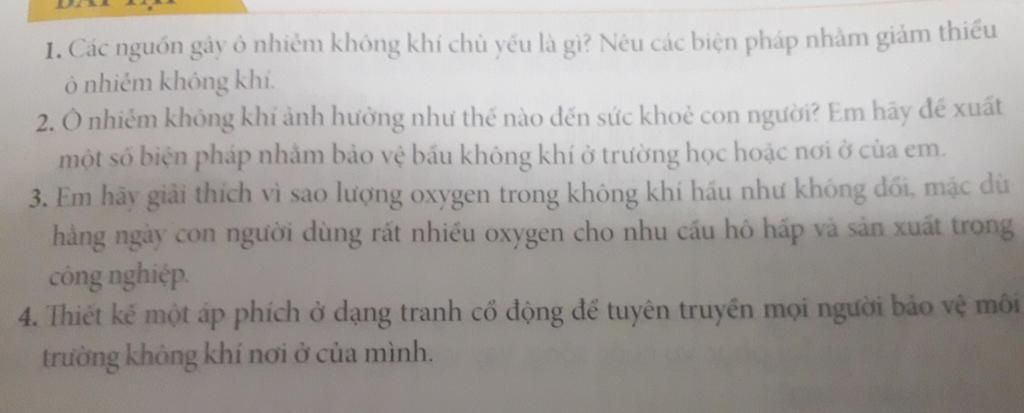 1.Các nguồn gây ô nhiễm không khí : cháy rừng,rác thải,khí thải nhà máy,khí thải từ động cơ tham gia giao thông,...Các biện pháp nhằm giảm thiểu ô nhiễm không khí : trồng nhiều cây xanh, phủ xanh đất trống đồi trọc , không vứt rác bừa bãi , sử dụng các phương tiện công cộng,...
