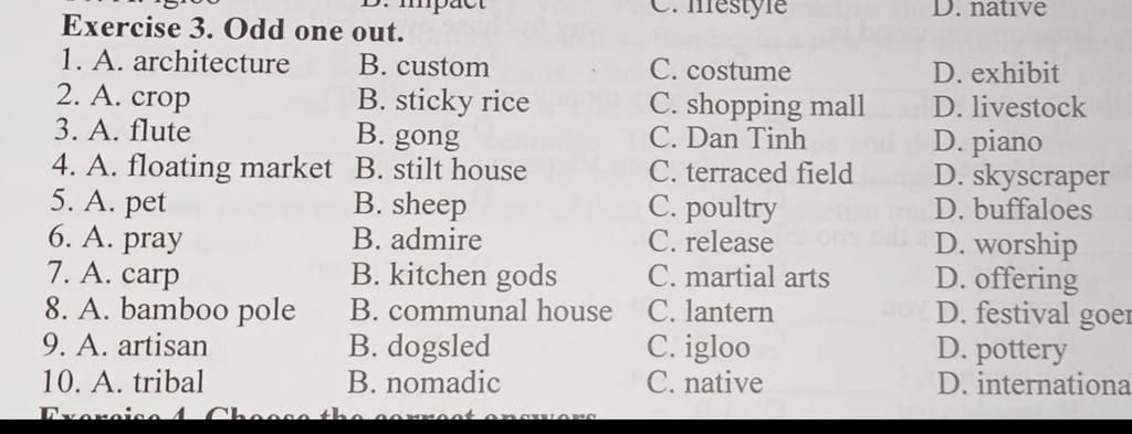 4. D (là công trình kiến trúc hiện đại, còn lại là truyền thống)