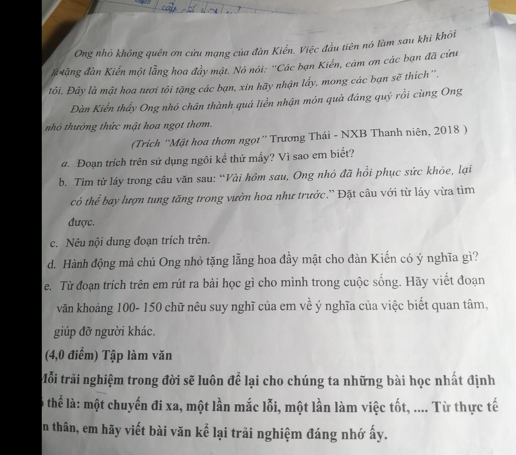 c. Nội dung: kể về việc ong tặng quà cho đàn kiến để tỏ lòng biết ơn của mình. Vì đàn kiến đã cứu mạng ong nhỏ.