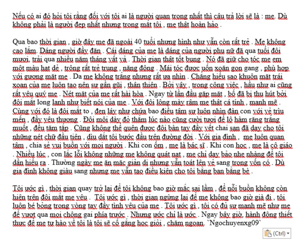 Nếu có ai đó hỏi tôi rằng đối với tôi ai là người quan trọng nhất thì câu trả lời sẽ là : mẹ. Dù không phải là người đẹp nhất nhưng trong mắt tôi , mẹ thật hoàn hảo .