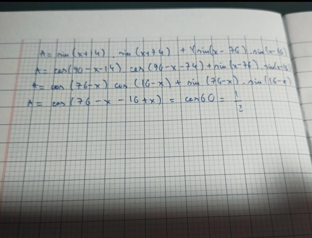 cho mình hỏi sao dòng cuối rút gọn sao ra cos(76-x-16+x) vậy ạ