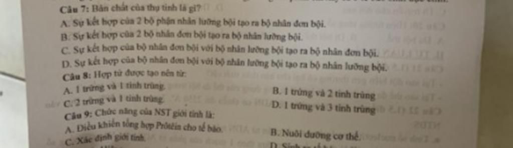 Câu 7: B. Sự kết hợp của 2 bộ nhân đơn bội tạo ra bộ nhân lưỡng bội