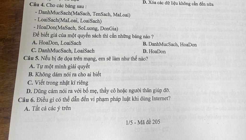 Câu 4. Cho các bằng sau: