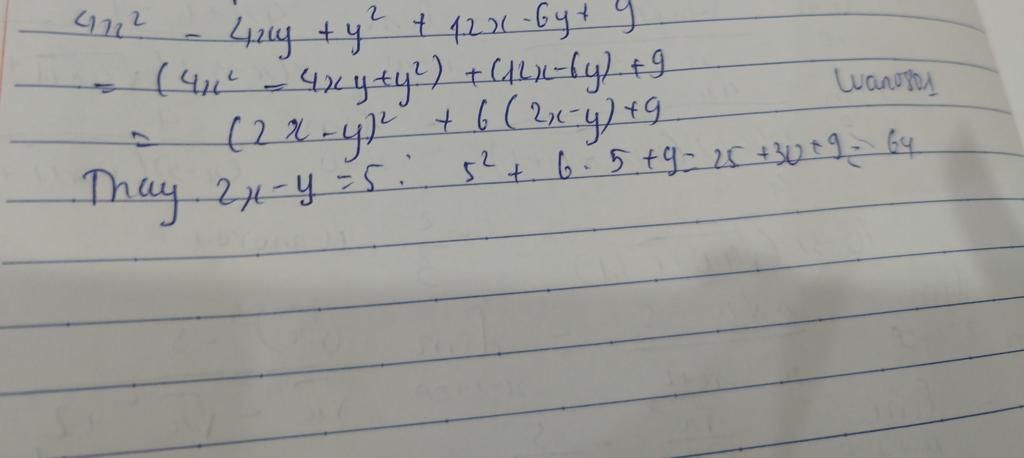 Có `: 4x^2 - 4xy + y^2 + 12x -6y +9`