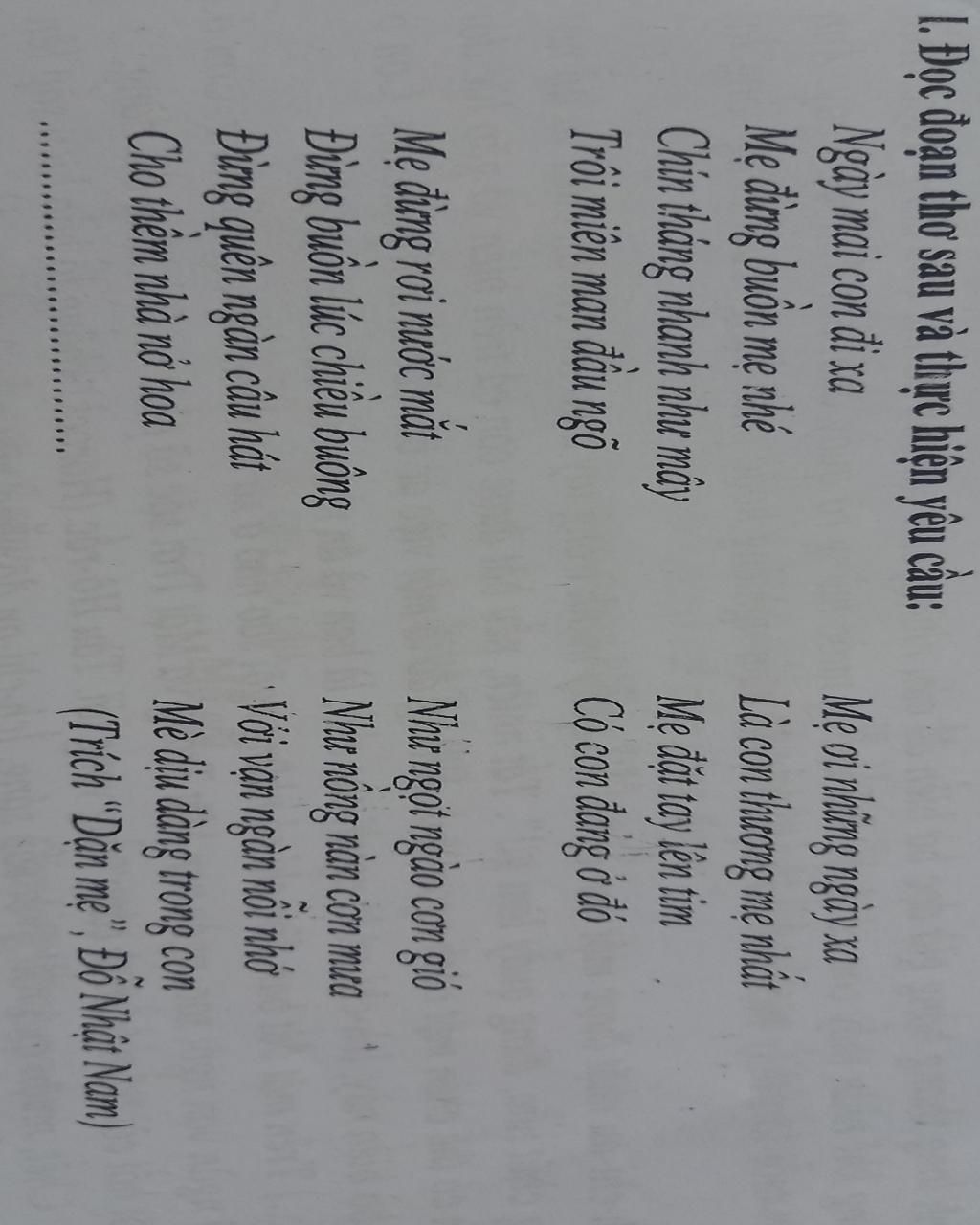 Câu 2 : Qua đoạn thơ được trích trong bài thơ " Dặn mẹ "của Đỗ Nhật Nam em cảm nhận được tình mẫu tử thiêng liêng và sâu sắc biết nhường nào. Có lẽ trên thế gian này dù có đi tìm ở bất cứ nơi đâu cũng chẳng ai tốt, sẵn sàng bao dung ta vào lòng như mẹ. Mẹ luôn kề bên ta mỗi lúc vui, buồn, khó khăn và mỗi chúng ta đều chỉ có một người mẹ mà thôi. Bởi lẽ thế mà hãy dành thời gian quan tâm, chăm sóc cho mẹ của mình nhiều hơn.