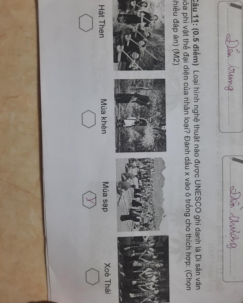 huyennguyenthi4Hiểu biết20:41 Kiến thức : Di sản Thực hành Then của người Tày, Nùng, Thái ở Việt Nam chính thức được UNESCO ghi danh tại Danh sách Di sản văn hóa phi vật thể đại diện của nhân loại. UNESCO đến nay đã ghi danh 14 di sản văn hoá phi vật thể của Việt Nam vào Danh sách Di sản văn hóa phi vật thể đại diện của nhân loại. Điệu múa Xòe quạt kết hợp với nhảy sạp, do cộng đồng dân tộc Thái đến từ tỉnh Sơn La thể hiện. Qua đây ta chọn đc 3 đáp án là Hát Then , Nhảy sạp , Xoè Thái Còn đáp án mùa khèn ko chọn vì : Nghệ thuật khèn của người Mông trở thành Di sản văn hóa phi vật thể quốc gia. Bộ trưởng Bộ Văn hóa, Thể thao và Du lịch Nguyễn Văn Hùng vừa ký Quyết định số 1401/QĐ-BVHTTDL về việc công bố Danh mục Di sản văn hóa phi vật thể quốc gia. Rút gọnhuyennguyenthi4Hiểu biết20:41 Kiến thức : Di sản Thực hành Then của người Tày, Nùng, Thái ở Việt Nam chính thức được UNESCO ghi danh tại Danh sách Di sản văn hóa phi vật thể đại diện của nhân loại. UNESCO đến nay đã ghi danh 14 di sản văn hoá phi vật... xem thêm