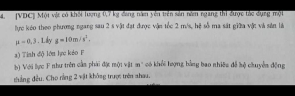 `<=> m' = F/(g\mu) = (2,8)/(10.0,3) = 14/15 (kg) ≈ 0,93 (kg)`.