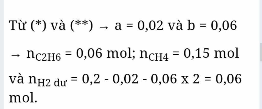 Hỗn hợp X gồm 0,15 mol CH4; 0,09 mol C2H2 và 0,2 mol H2. Nung nóng X với xúc tác Ni thu được hỗn hợp Y. Cho Y qua dung dịch brom dư thu được hỗn hợp khí Z (có tỉ khối so với He là 4). Biết bình brom tăng 0,82 gam. Tính % thể tích của C2H6 trong hỗn hợp Z.