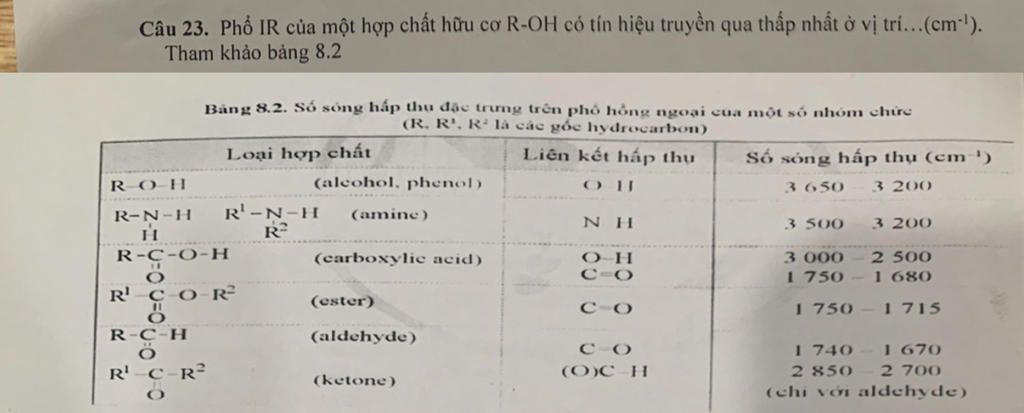 R-OH là hợp chất hữu cơ chứa nhóm chức `-OH` (alcohol) có tín hiệu truyền qua thấp nhất ở vị trí `3650(cm^{-1})`