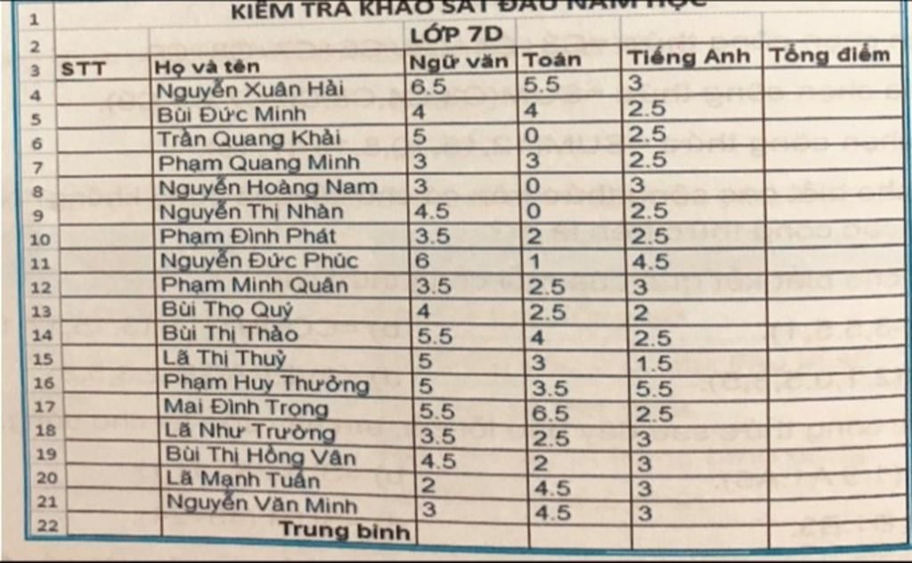 b) Dùng công thức tính tổng điểm của mỗi bạn, biết môn văn, toán có hệ số 2, môn tiếng anh hệ số 1.