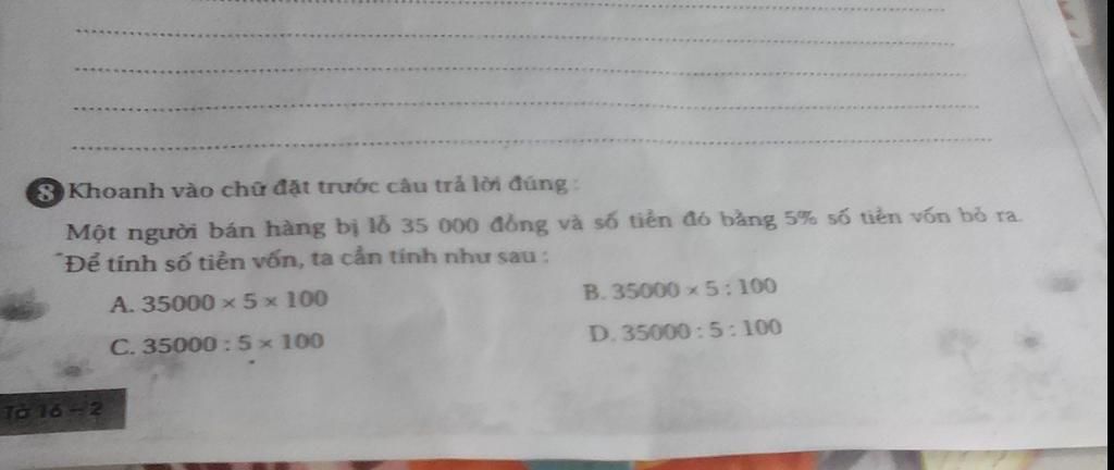 Một người bán hàng bị lỗ 35 000 đồng và số tiền đó bằng 5% số tiền vốn bỏ ra
