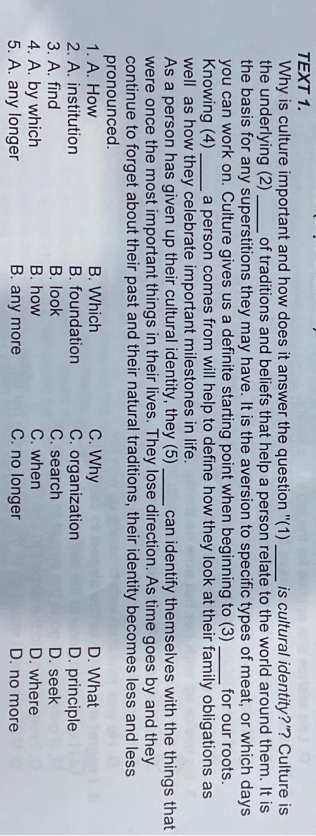 1. A. How - This option is incorrect because it does not fit grammatically or logically in the context of the sentence. The question is asking for the reason or purpose of cultural identity, not the method or manner in which it is defined.