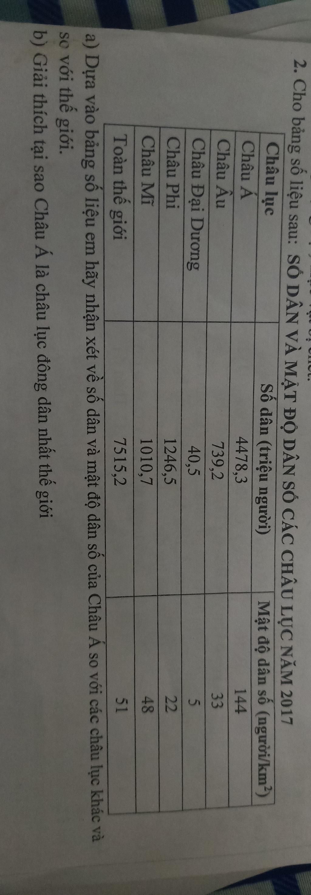 a) Từ bảng ta nhận thấy mật độ dân cư của châu Á đông hơn các châu lục khác.