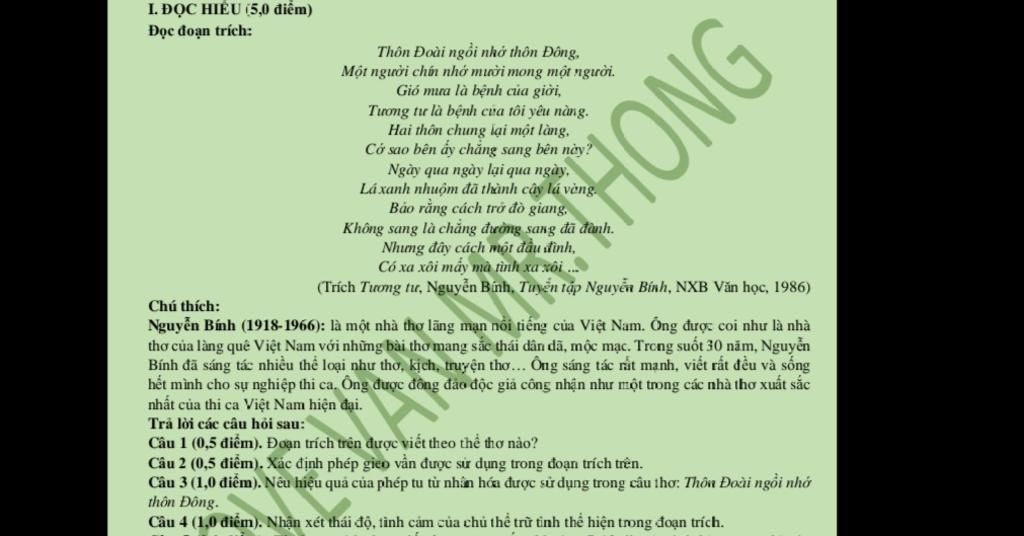 Câu 3 (1,0 điểm). Nêu hiệu quả của phép tu từ nhân hỏa được sử dụng trong câu thơ: Thôn Đoài ngồi nhớ thôn Đông.