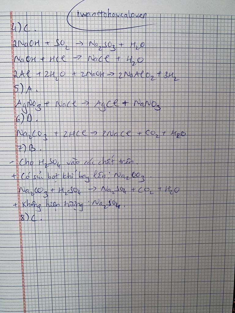 Câu 7 B Vì có khí thoát ra là `Na_{2}CO_{3}`, Không hiện tượng là `Na_{2}SO_{4}`