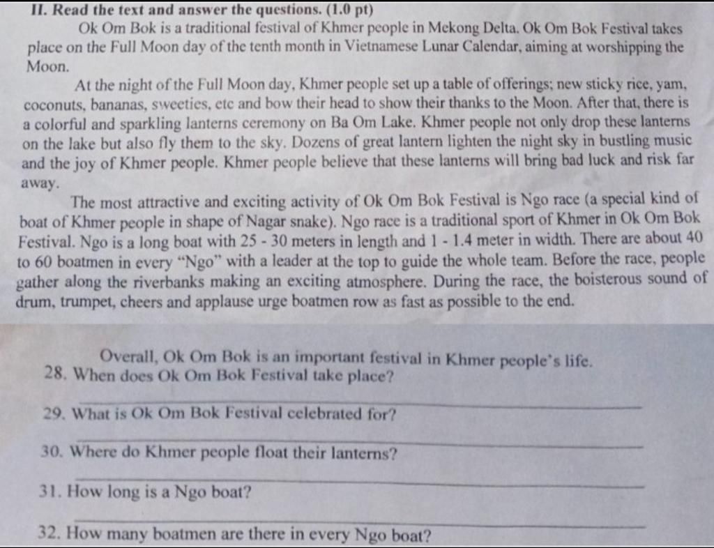 `-` Dẫn chứng: Ok Om Bok Festival takes place on the Full Moon day of the tenth month in Vietnamese Lunar Calendar, aiming at worshipping the Moon.