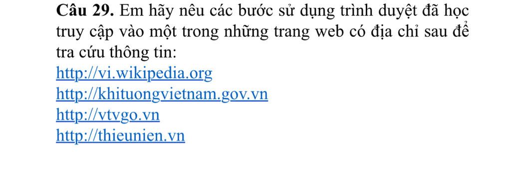 Câu 29. Em hãy nêu các bước sử dụng trình duyệt đã học