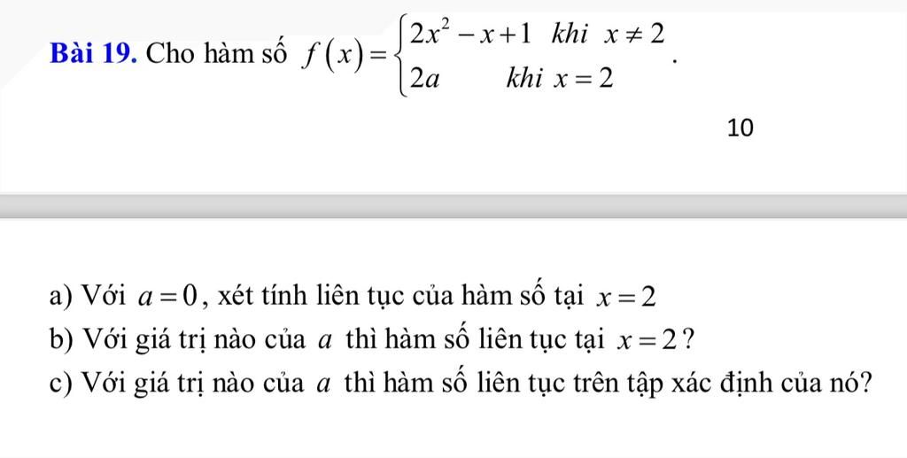 `a)` Khi `a=0`, ta có: `f(x)={(2x^2-x+1 \ "khi" \ x ne 2),(0 \ "khi" \ x=2):}`