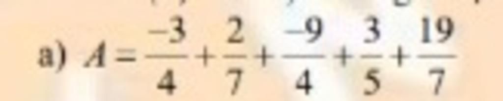 `A = ( -3/4 – 9/4 ) + ( 2/7 + 19/7 ) + 3/5`