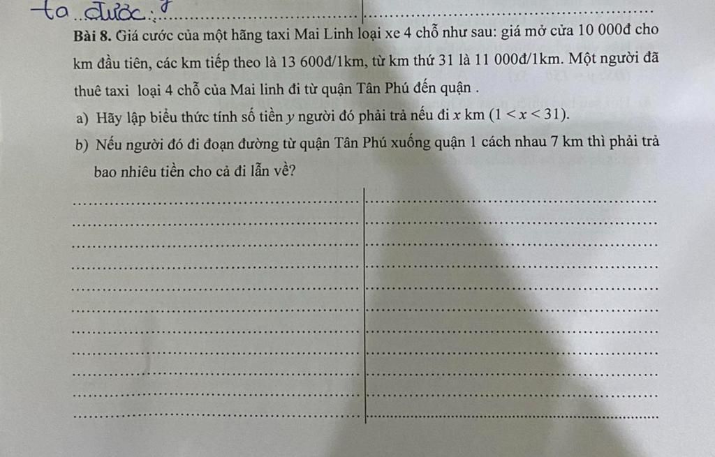 Bài 8. Giá cước của một hãng taxi Mai Linh loại xe 4 chỗ như sau: giá mở cửa 10 000₫ cho