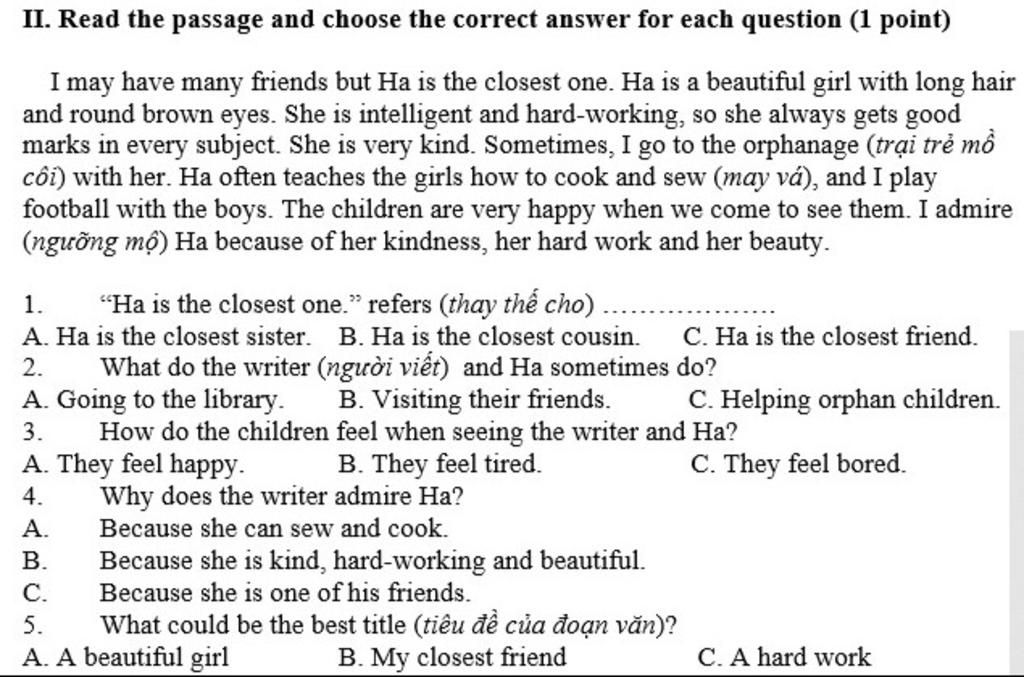 cả đoạn giới thiệu về Hà , người bạn closest friend ( bthan ) nên chọn B , loại A và C vì cả hai đều nói về những phẩm chất tốt của Hà , không bao quát bằng B