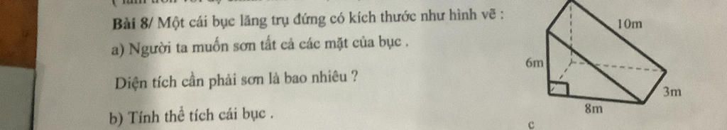 V = $\frac{6 . 8 }{2}$ . 3 = 72 (m³)
