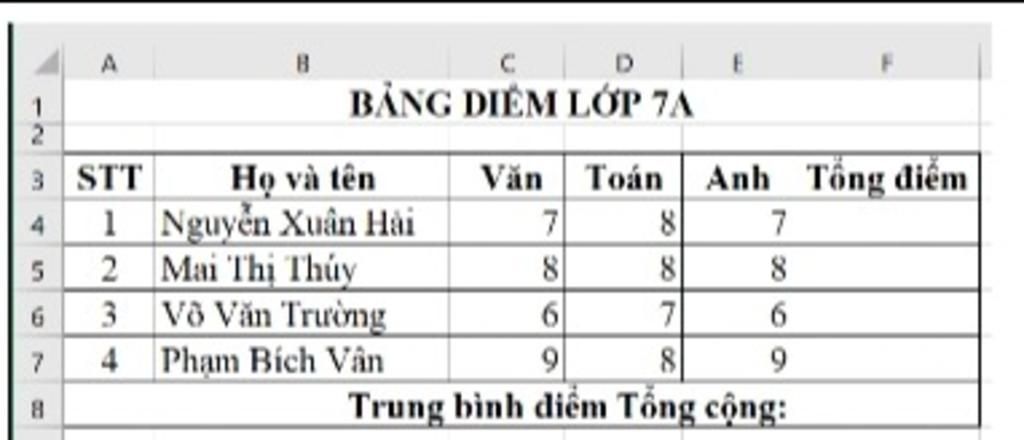CÒN ANH VĂN : (=AVERAGE"E4:E7") = 7.5