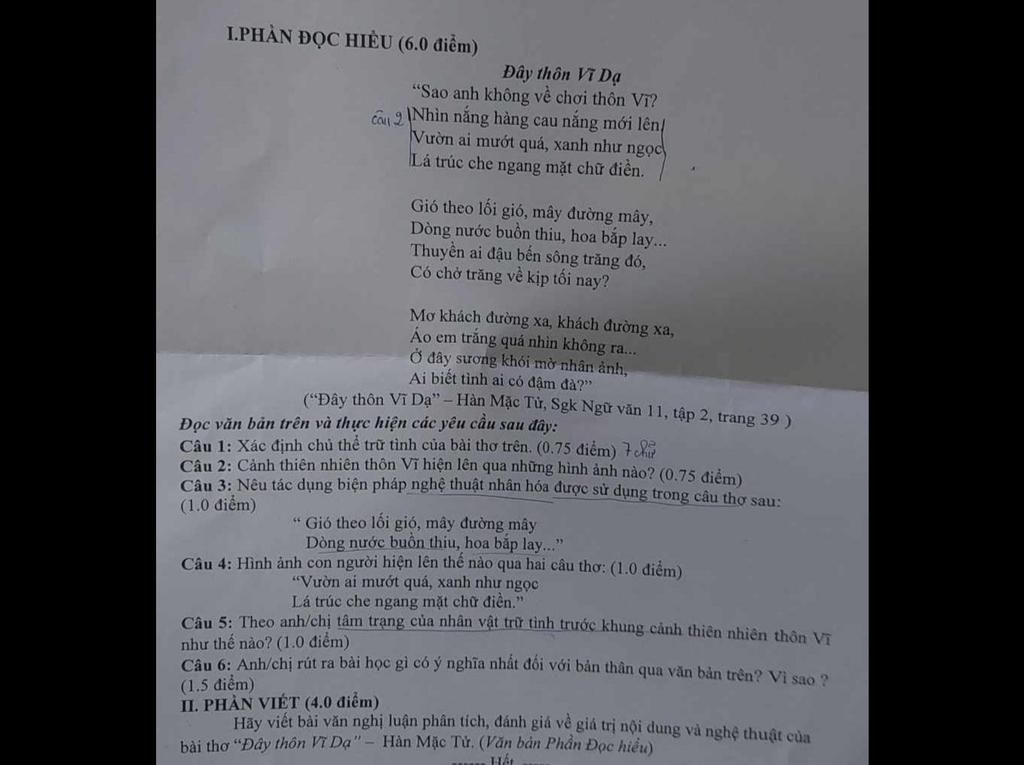 Câu 5: Tâm trạng của nhân vật trữ tình trước khung cảnh thiên nhiên thôn Vỹ Dạ: là niềm khát khao được về chơi thôn Vỹ, về với những gì tươi đẹp và tràn đầy sinh khí nhất nhưng cũng thể hiện nỗi cô đơn khi phải chịu đựng số phận bất hạnh của mình