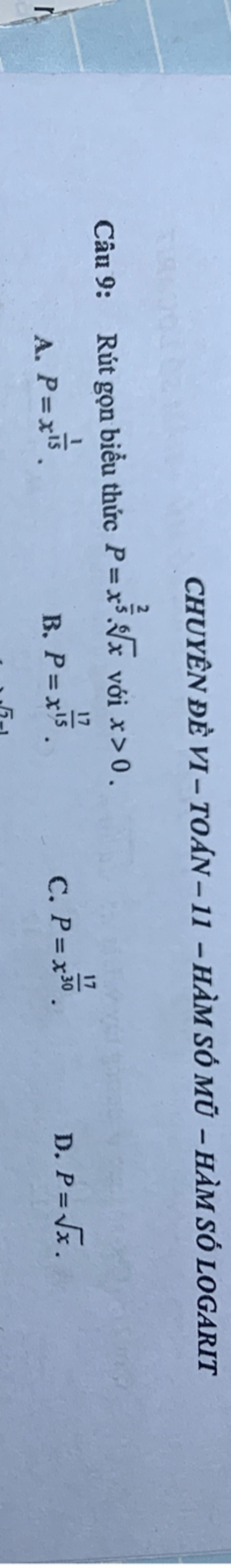 `=>` Vì `P = x^(2/5) . root(6)(x) = x^(2/5) . x^(1/6) =x^(2/5 + 1/6) = x^(17/30)`