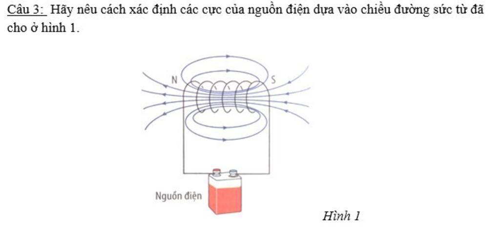 Áp dụng quy tắc nắm tay phải, ta xác định được chiều dòng điện như hình vẽ. Dòng điện đi từ cực dương sang cực âm nên ta xác định được cực của nguồn điện như hình vẽ.