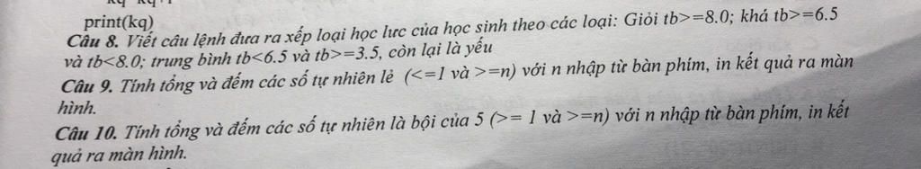 Câu 8. Viết câu lệnh đưa ra xếp loại học lực của học sinh theo các loại: Giỏi tb>=8.0; khả tb>=6.5